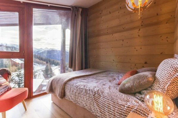50m from ski slopes, 9th floor, view valley, balcony, fireplace or stove, tv, ski locker, 59m²