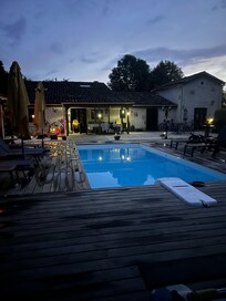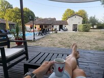 Mooi pittoresk Frans huis met reusachtige tuin waar meer dan genoeg ligbedden, stoelen en schaduwplekken beschikbaar zijn. Het zwembad is erg schoon en op de juiste temperatuur en wordt dan ook dagelijks gereinigd. Verder zijn er 3 fietsen aanwezig om lekker in de buurt te toeren (ochtendboodschappen deden wij lekker op de fiets). Voor de fietsliefhebbers zijn er mooie fietswegen en talloze mountainbikeroutes vlakbij. Last but not least waren Elizabeth en Bones zeer vriendelijk, behulpzaam en gastvrij! Heerlijke vakantie gehad en zeker een aanrader voor gezinnen met kinderen. Heel erg bedankt voor de fijne tijd! Groet, Chris en familie.