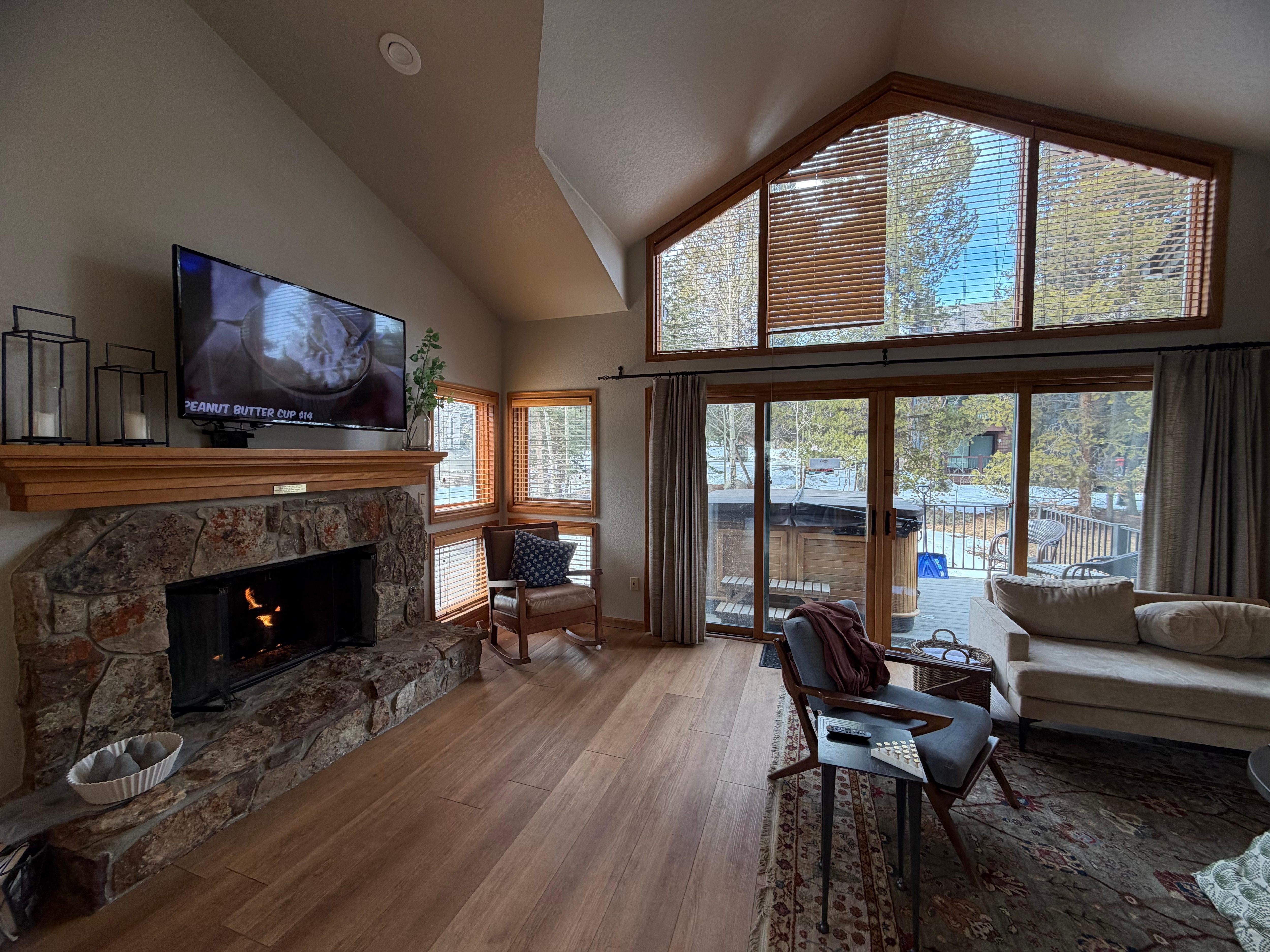 We came for three nights with our adult kids! They really enjoyed the hot tub. The master bedroom mattress was comfortable, but the downstairs mattresses were not. The TV in the queen room was not working. And the Wi-Fi was wonky and hard to figure out, but we managed.We loved that the condo was one of the first in the complex and easy to get to. We had no problems walking over to Main Street, it was fast and easy! We enjoyed all of the room and the fireplace! We had troubles with locking the back door and the icemaker was broken. But other than that, everything was great! The owner was very quick to get back with me on a couple of questions. While we were there, we enjoyed all of the restaurants and shopping and went snowmobiling and had a blast! Thank you for your hospitality. Yup: make sure you don’t lock the door knob on the way out. Only lock the deadbolt. We managed to lock ourselves out lol but got back in through the garage.