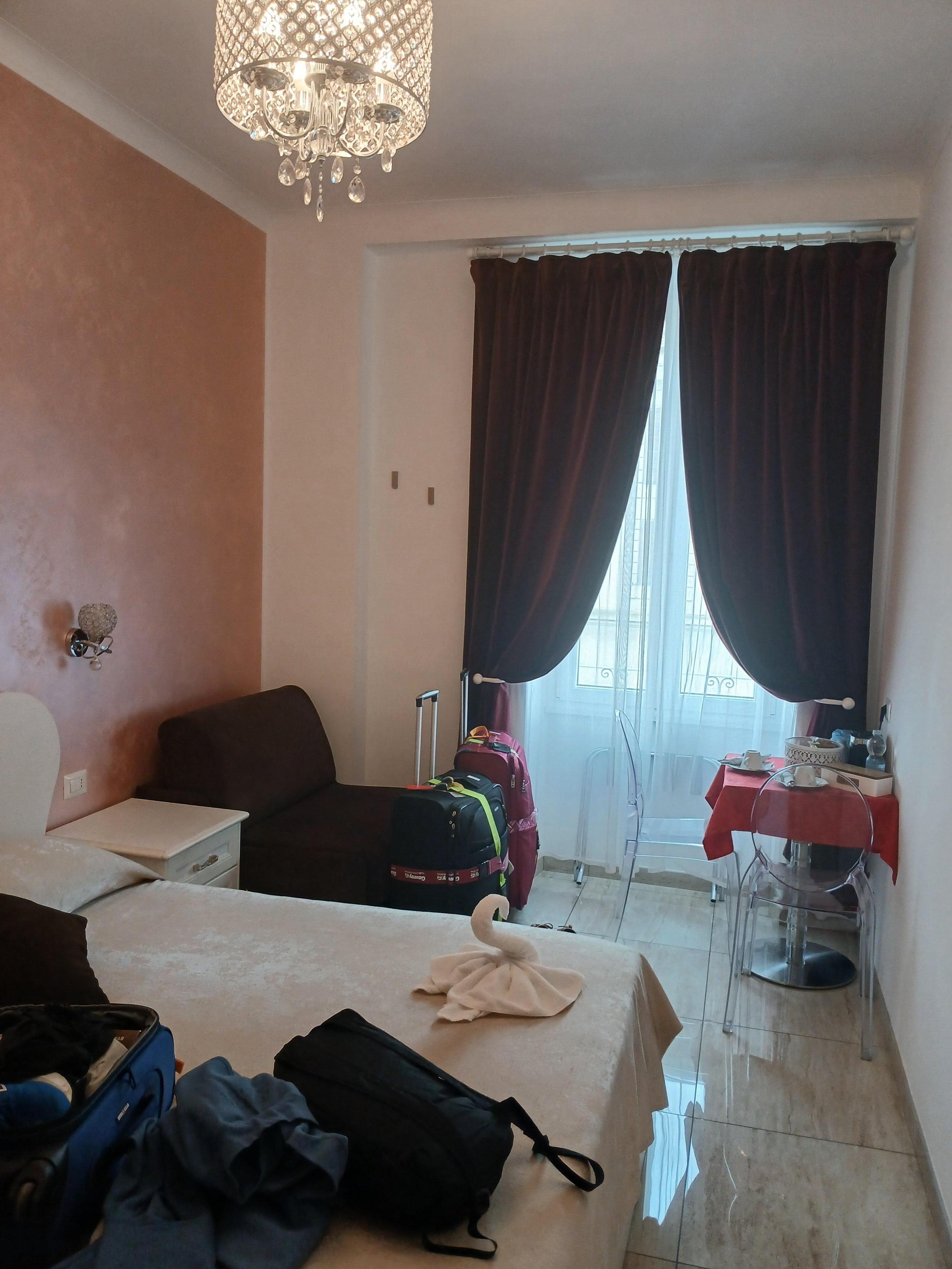 A great little place in Italy. Great price. Clean. Nice big towels. Everything you need the days before a cruise. Right in downtown Civitavecchia. Steps away from restaurants and little shops. Close to free town shuttle. 10 minute walk to where tours start. Lovely helpful gentleman that runs the place. Answers all your questions with great patience. Adequate breakfast. Prepackaged buns. Juices, yogurt, water and beer left in fridge for you. Kettle with teas and coffee. All you really need.