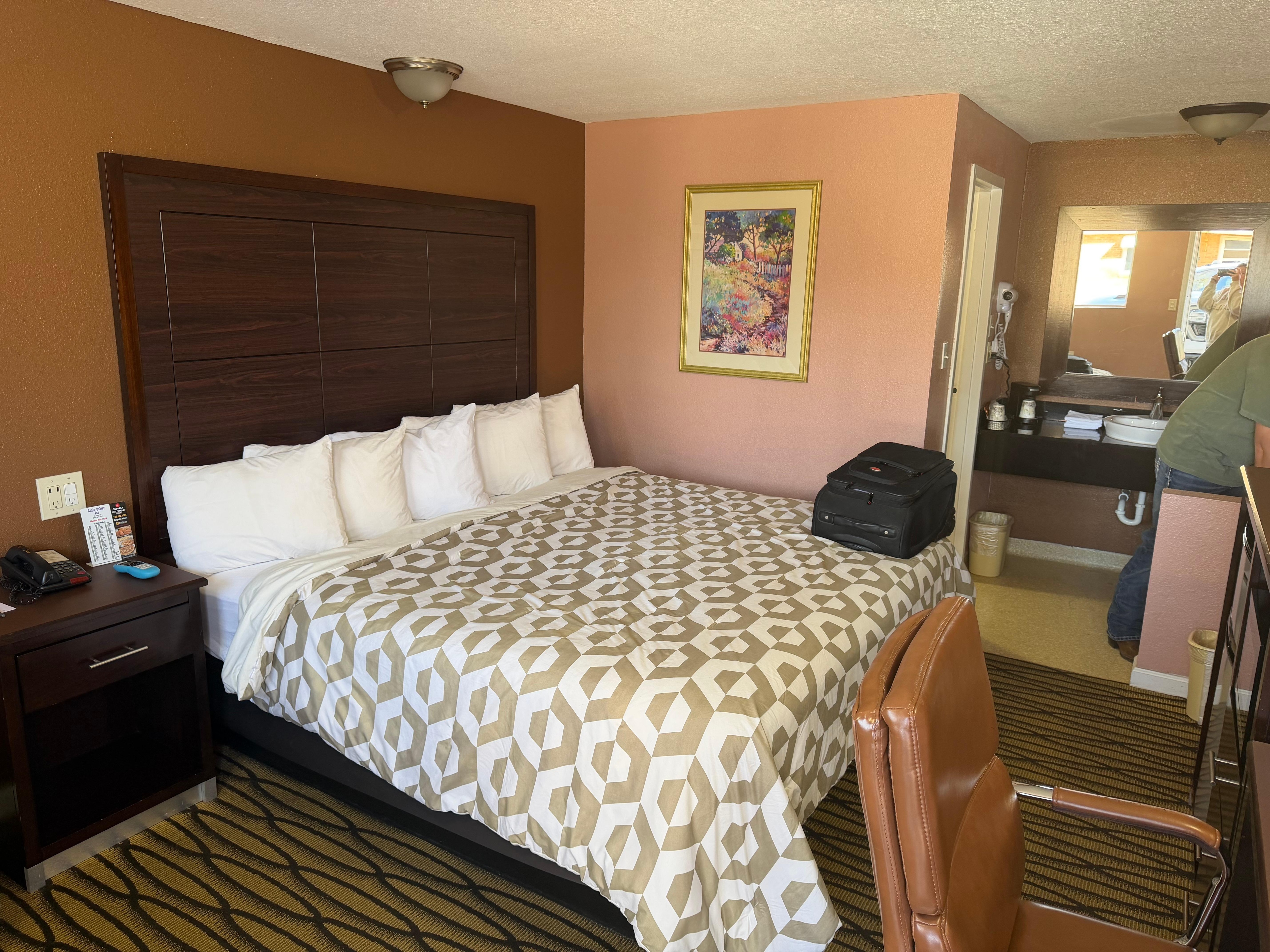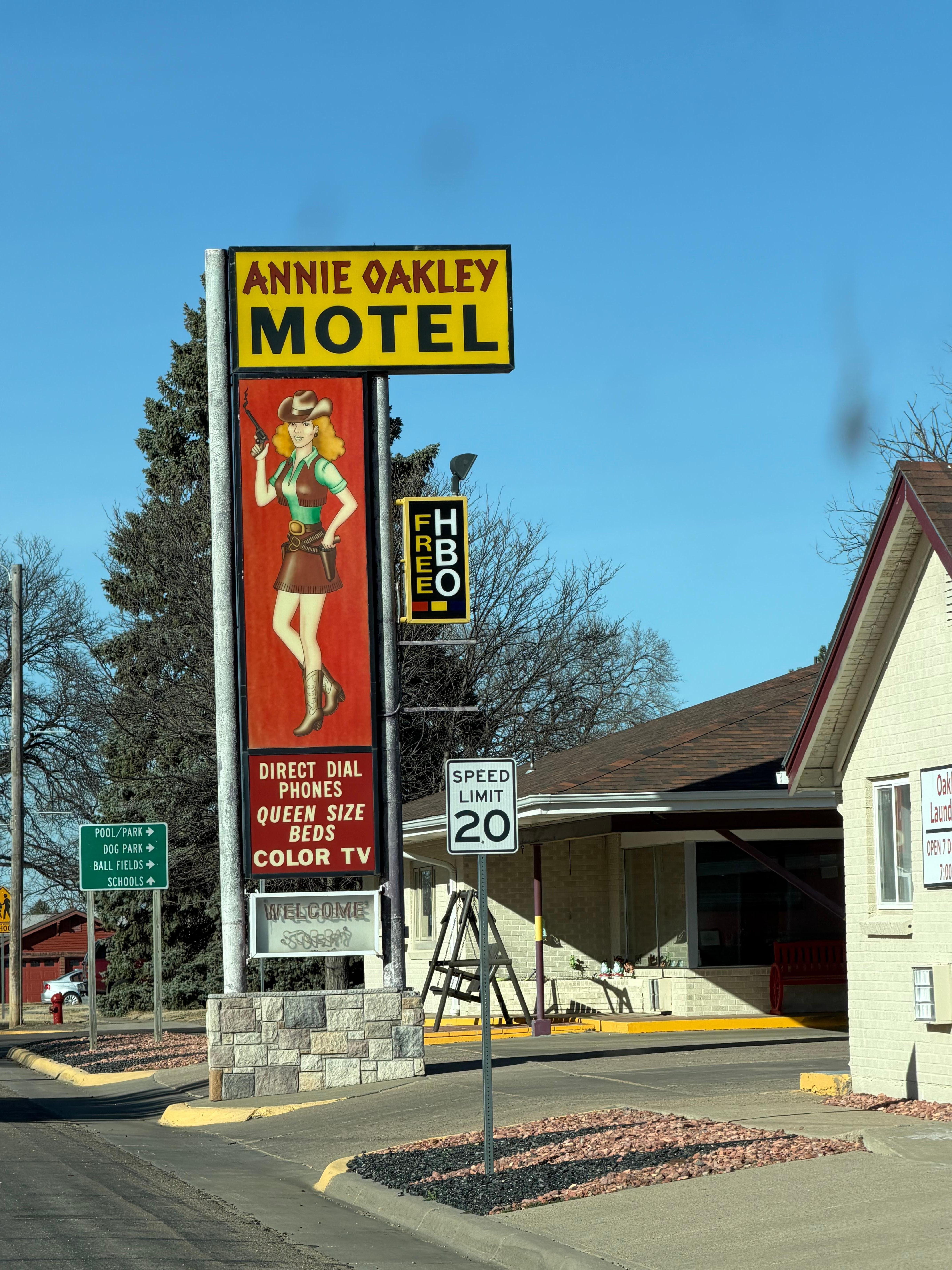 The room was fine (good TV) but small. Microwave and who is this fridge. The staff was courteous. It's truly okay, nothing special. You need to expect a kind of retro feel--for example, it might help to know that if you remember who "Annie Oakley" was you might also be where attracted by "direct dial phones" and "color TV," as the sign outside advertises.
