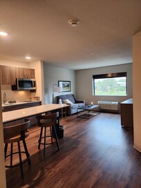 Second, one of the outlets in our room didn't work. It was where the only lamp was plugged in at. It was located closest to the seating so it made it a pain to charge phones. We let the front desk lady know, who attempted to help us but never got back to us on if the problem could be resolved or not. My husband went back down to the desk to find out and she provided us with an extension cord so that was helpful.