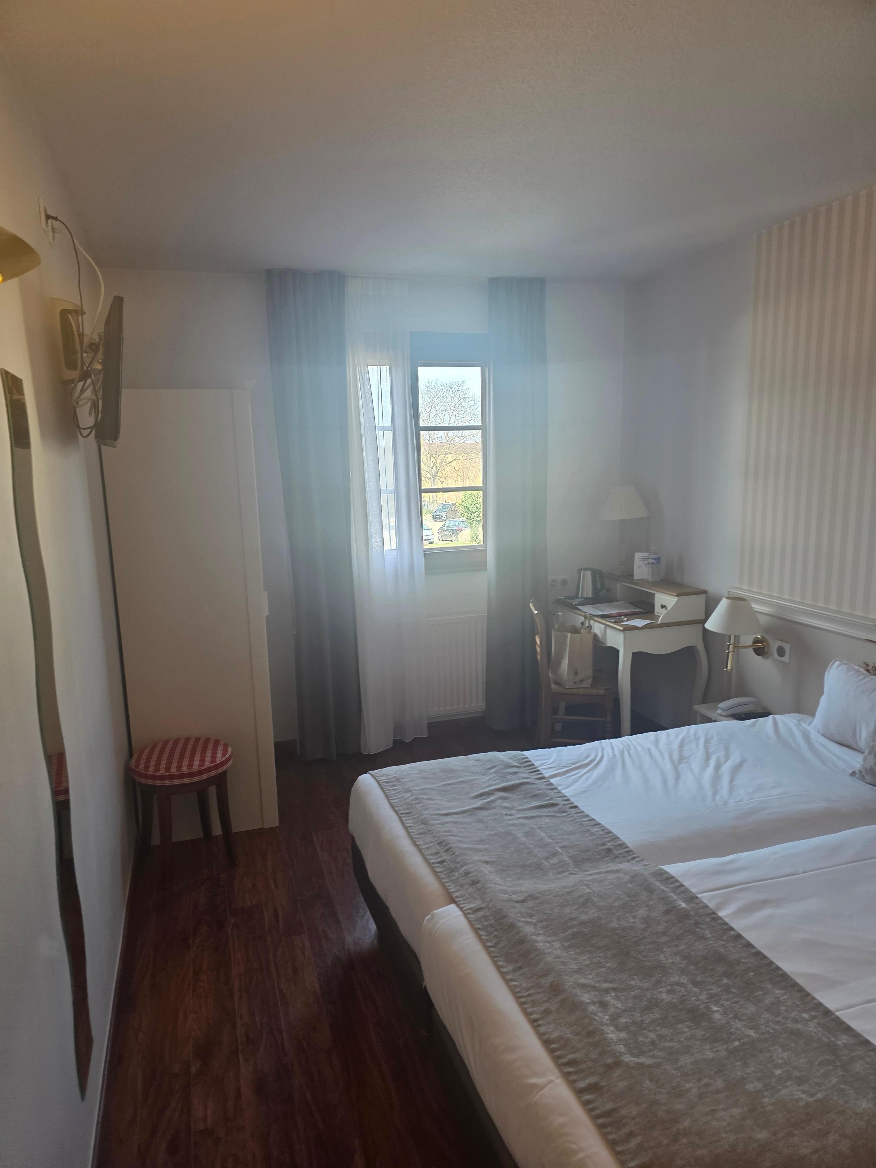 Sehr schöne idyllische Unterkunft. Etwas in die Jahre gekommen (Kondenswasser läuft beim Fenster herunter und bildet dort Schimmel, Farben blättern ab), neue schöne Regendusche. Preis-Leistung voll in Ordnung. Personal war freundlich. Großer Privatparkplatz hinter dem Hotel. Essen im Hotelrestaurant wunderbar.