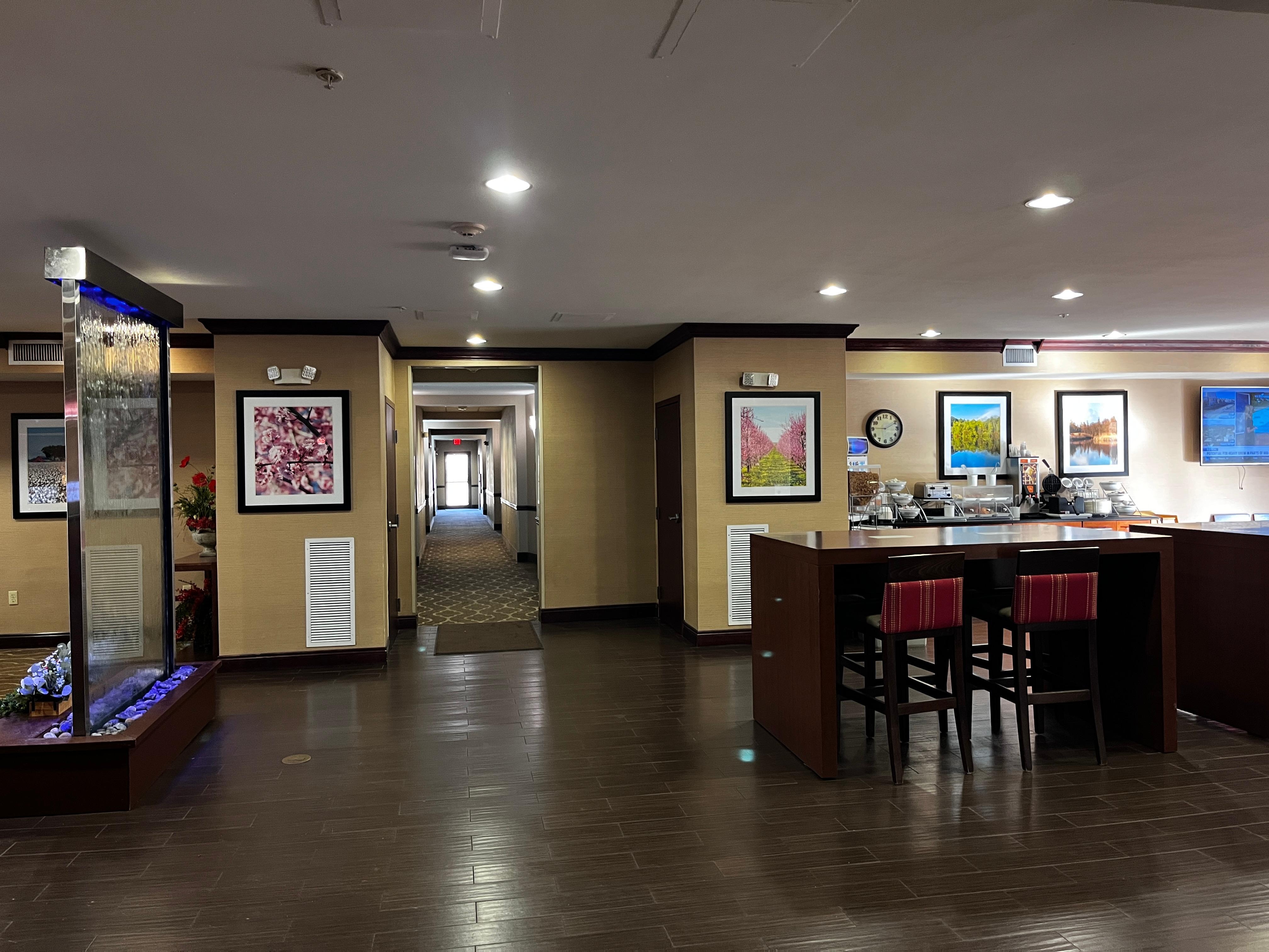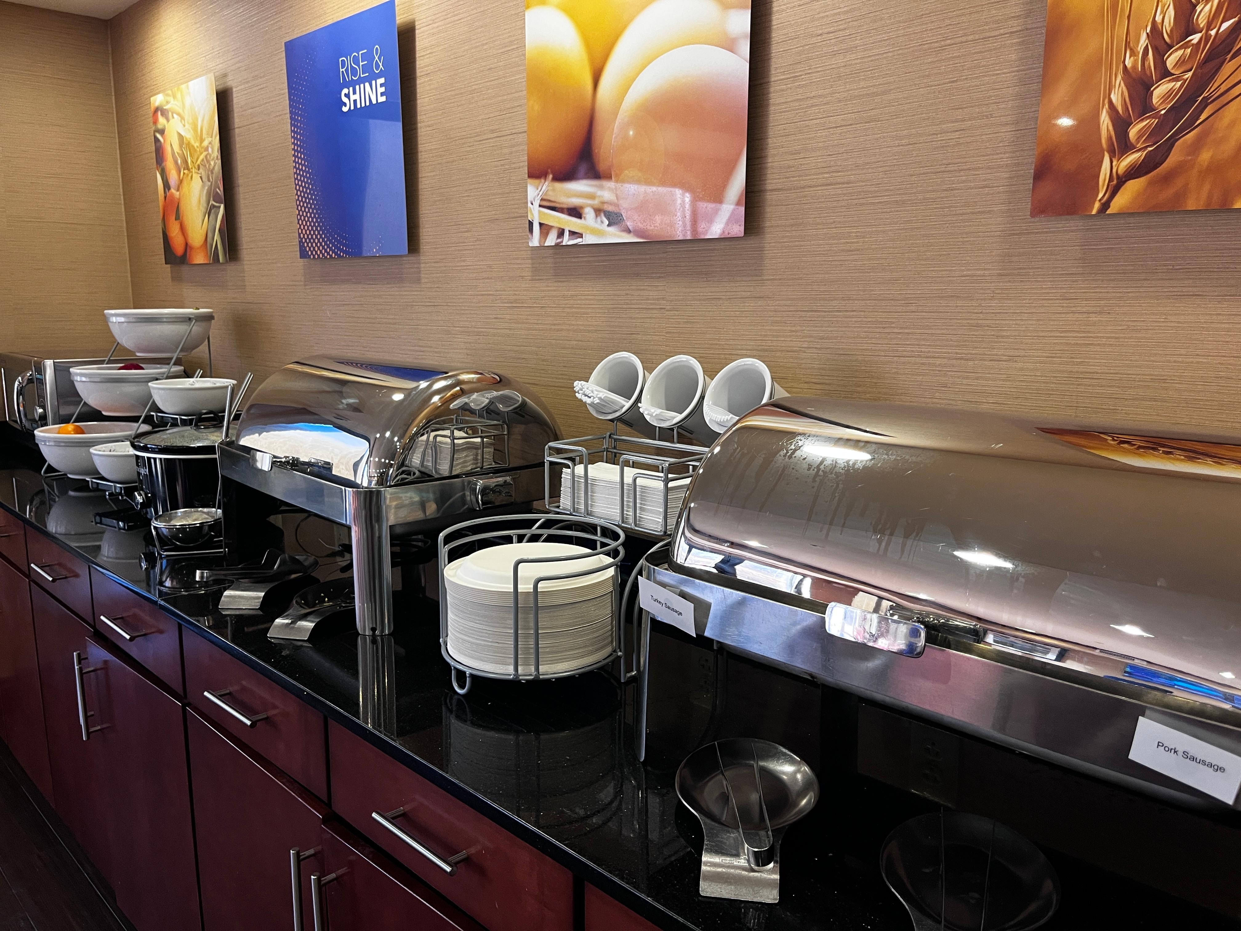 The breakfast area is extremely well stocked - plenty of protein and fresh fruit options but also your carb bar complete with cereal options, pastries, waffle maker, toaster, etc. The sausages were cooked right and everything tasted great. My only suggestion: some good picante/salsa. NOTE: Come early, because breakfast will be put away by 9:30.