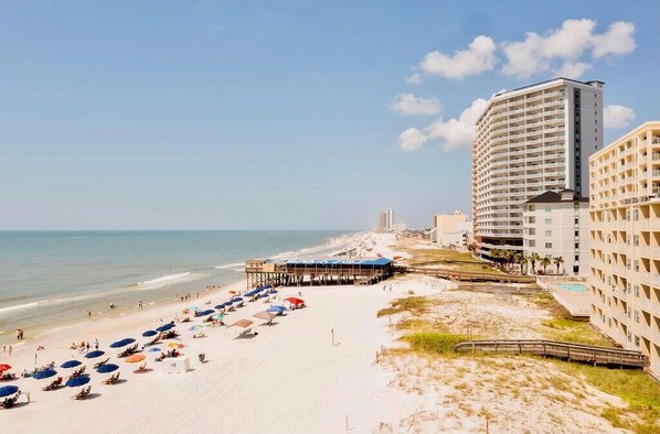 Sol y diversión en la playa, cerca de Gulf State Park (parque)