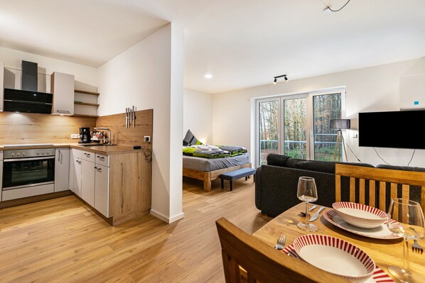 Las habitaciones de este departamento disponen de cafetera/tetera y secador de pelo. La cocina está dotada de refrigerador, placa de cocina, microondas y utensilios de cocina.