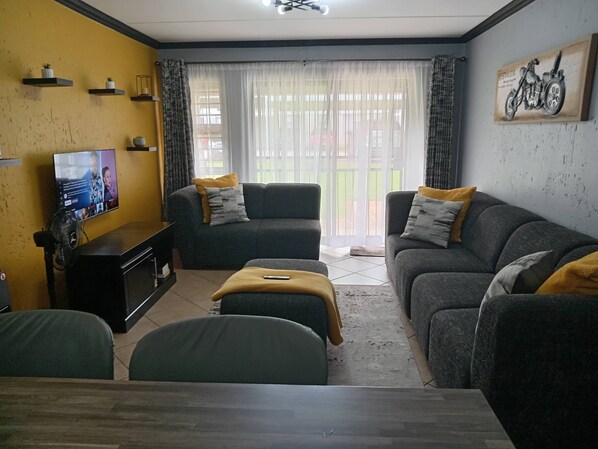 2 Bedroom apartment with 2 queen size beds & a cot, 10 minutes from JHB Airport.