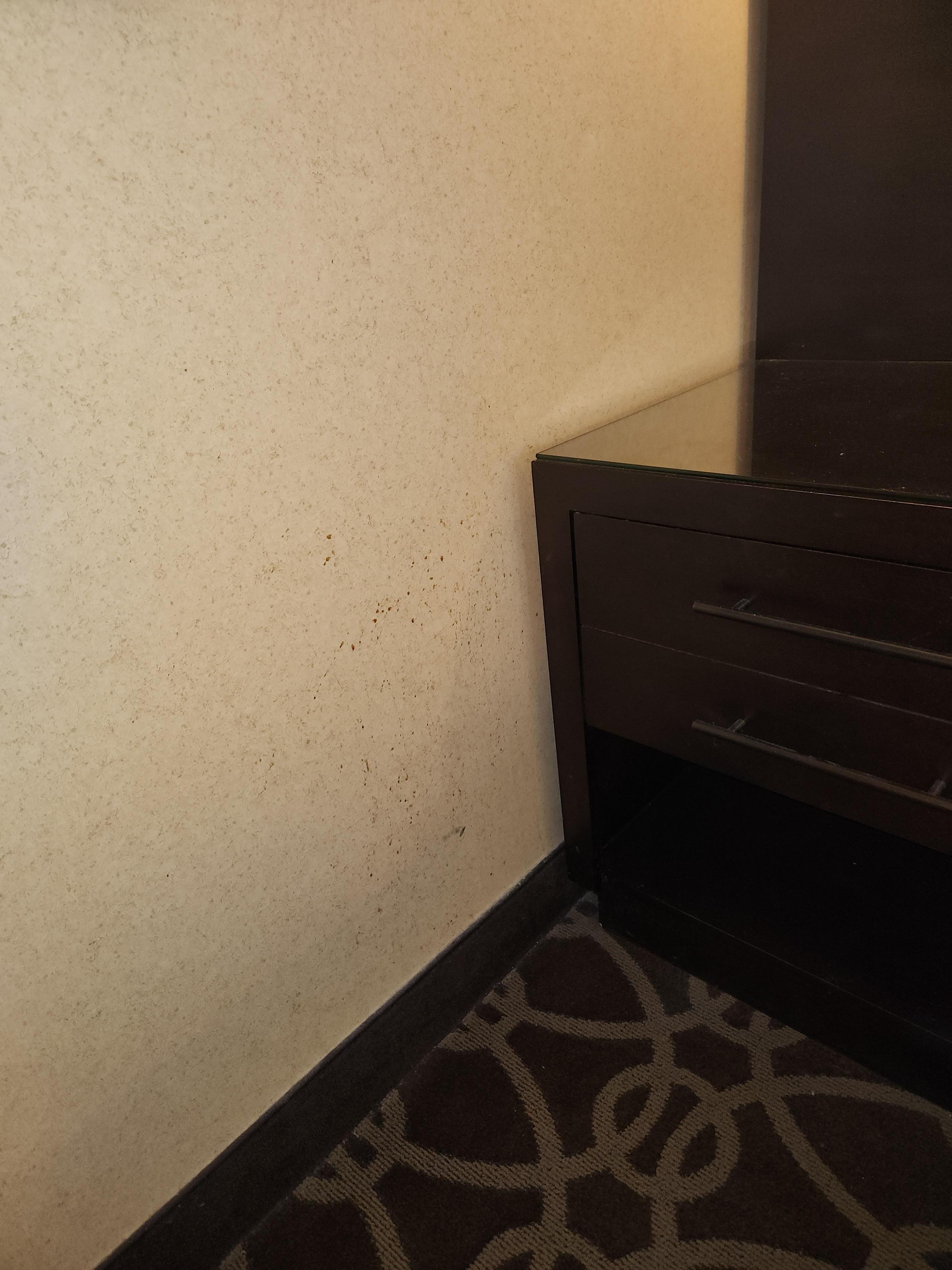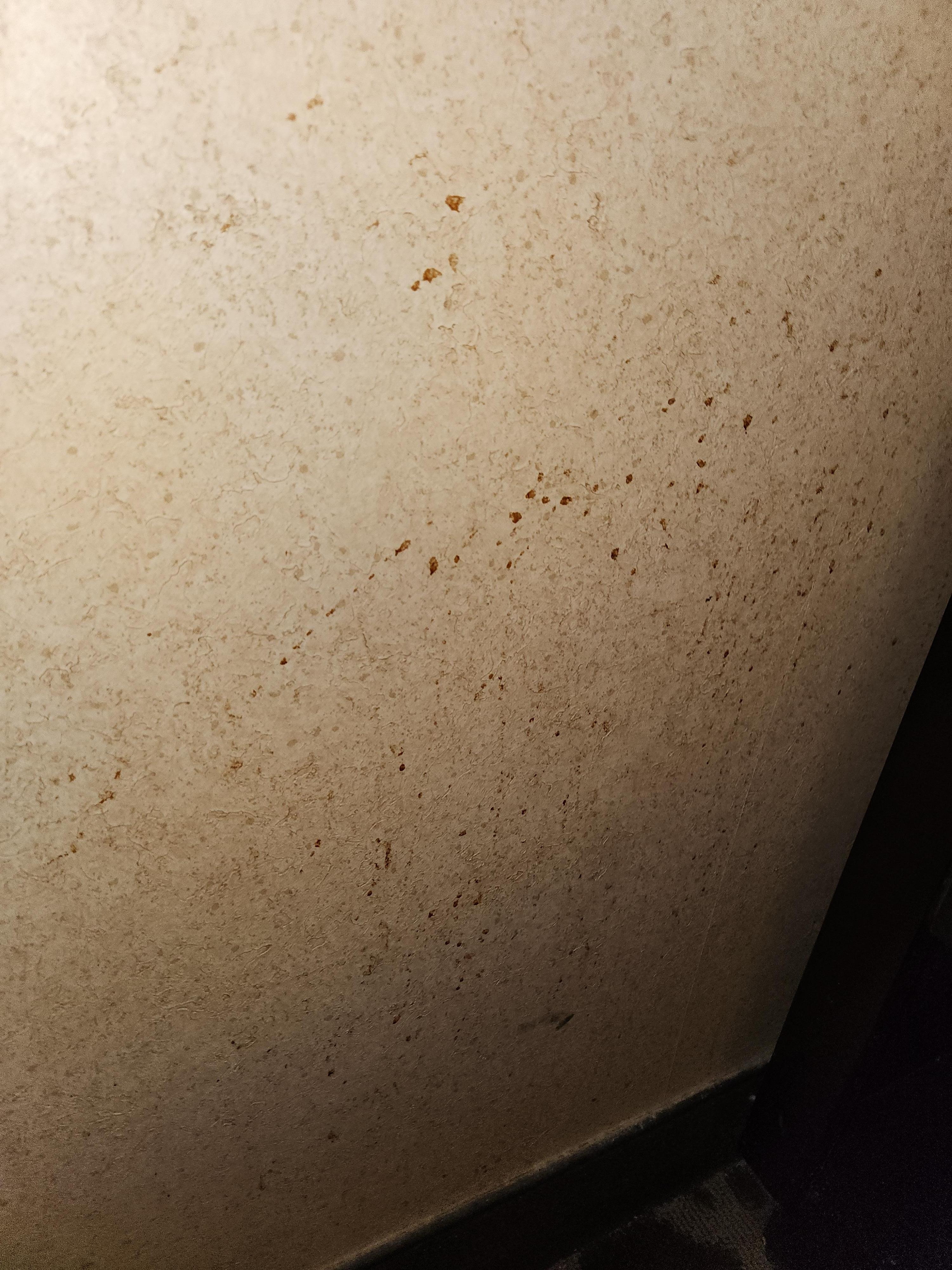Splatter stain on wall next to bed.