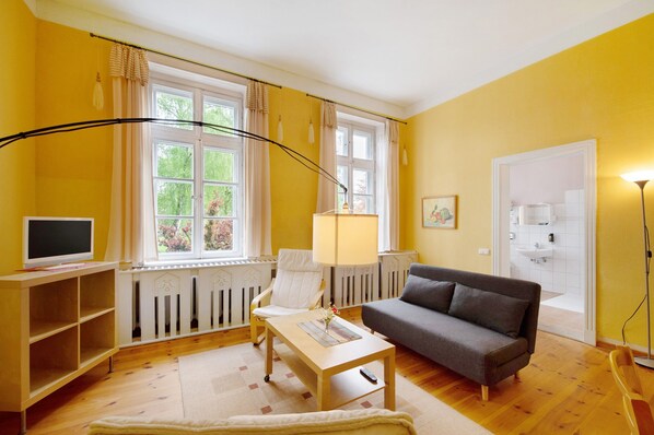 Die sehr geräumige Ferienwohnung befindet sich in einem prächtigen Herrenhaus. Diese Wohnung ist auch mit einem Rollstuhl erreichbar, man muss jedoch durch den Garten über ein Stück Wiese fahren. Auch die Dusche ist total ebenerdig.