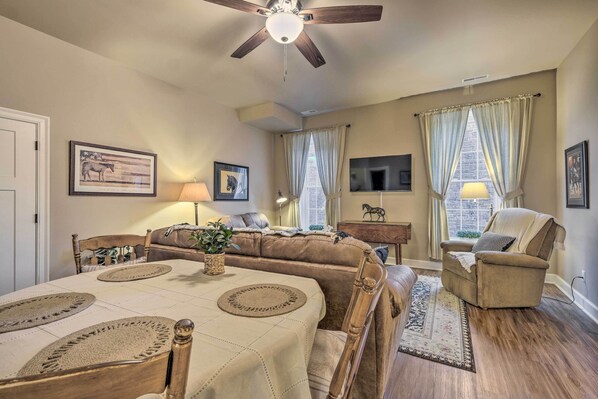 Dining area has a round table with chairs, living area has a tv with streaming service, a recliner, very comfy couches and carpet, plenty of closets! The windows are nice and blackout curtains.