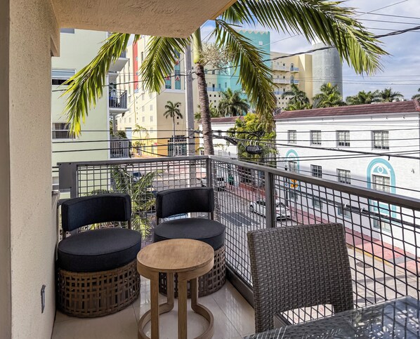 Check-in was quite easy. The place was spotless, and I felt like its pretty well maintained. It's on the 3rd floor, and has an elevator AND an airy stairwell. The small terrace was nice to sit out and overlook the community. We enjoyed our stay, the location was great, and there were plenty of places to grab a bite. I would recommend Maman for breakfast/brunch, and excellent coffee. Stay on Collins for about 3 blocks, same side of street, you'll walk right by it!My only issue or suggestion is to provide cleaner looking towels. My husbands washcloth had mascara stains. I knew what it was and assured him it was clean, but he was not happy about it. Also, the towels and wash clothes need to be changed. They were pretty dingy. Last, I'm big on soft sheets. The down comforter was great, but the sheets were not comfortable.