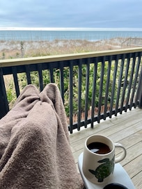 The condo was absolutely beautiful with a wonderful and clear view of the beach and ocean. Even saw a whale breech the waves one day- A first for me down here! The newly changed oceanfront windows were perfect when it was too cold, windy, or rainy to sit on the porch. And when I could, I wrapped up in my coat, hat, and blanket and sat outside to take it all in - lots of space and privacy. The bed was comfortable (would be great to have black out curtains for the early morning hours), and the kitchen was well stocked with everything I needed. The smart TV was great as well to catch up on Netflix shows and watch movies on prime at night and when it was raining. It was very clean and had a mild air freshener somewhere that kept the clean & fresh smell always present (mild nice scent and definitely not overwhelming). The only bummer was the fire place wasn’t working. I’d never seen a fire place at the beach but this weekend was exceptionally cold and windy, and I was looking forward to the fire and the added relaxing ambience fires give when it’s cold & rainy. Maybe next winter. The other thing was the TV in the master wouldn’t turn on despite using all remotes- most likely was out of batteries I’m guessing. Still, that was not a big deal either as the sofa in the main room was really comfy to curl up on and watch from there. Truly loved my weekend away to recharge in this beautiful condo with the amazing views of the ocean and steps to the sand. Thank you for sharing your home!