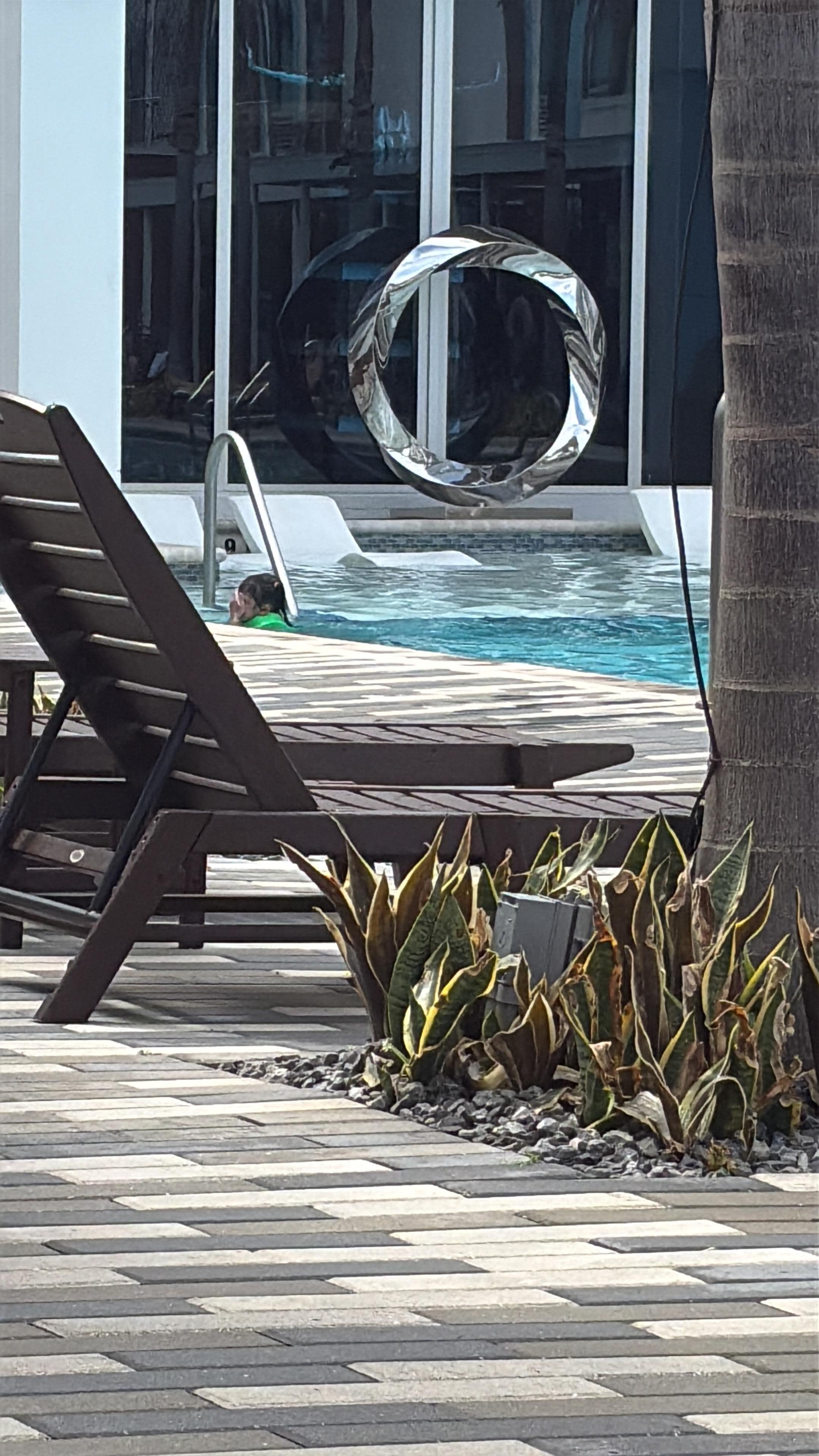 Tiene piscinas para niños, jacuzzi al aire libre y sauna. Una decoración muy original.