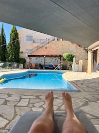 Beautiful home to stay in. Stunning views of Peyia and the sea in the distance. Very well stocked kitchen and comfy seating and beds. Very clean and homely. Plenty choice outside to sit in full sun or shade around the pool even for 6 adults. The beach entry pool is a little steep but once you’re aware of this it’s a stunning pool to cool off in. Very quiet area but as is usual for Cyprus a bit of building work going on but not intrusive at all and we had been informed of this by the agents. The agents were so good from start to finish. Aimee was easily contactable through WhatsApp and was quick at answering questions before and during the stay. We arrived late at night and again as usual with Cyprus, especially Peyia you need your phone map to find the house plus the directions provided. A bit tricky in the dark at first. Car absolutely essential because of the hilly area. We had a good welcome pack of essentials plus a lovely gift for us as it was our Golden Wedding Anniversary. Plenty of good places to eat in Coral bay and sea caves area. Highly recommend Porto Antico for lovely food and onrioh bar by the ship wreck to watch the sunset. The two sandy beaches at coral bay beautiful and give a different sea experience. Calm or waves. The beach at Pissouri was difficult to access and exit the water due to steep shingles for us older folk. The water park at Paphos was an excellent day out and we got a second day for half price. Great stay lovely villa and great agents.