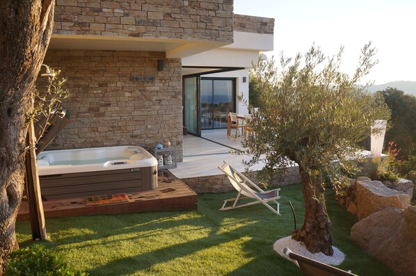 The house itself has a wonderful and deliberate layout. In the ground floor there is the main living room that is combined with the kitchen area. The living room has a glass front towards the main patio that can be opened up which means that being inside of the house or outside on the patio flows smoothly into each other. From both the living room and the main patio you have a stunning view on the Golf or Figari, the Mediterranean Sea and the hills of Sardinia.