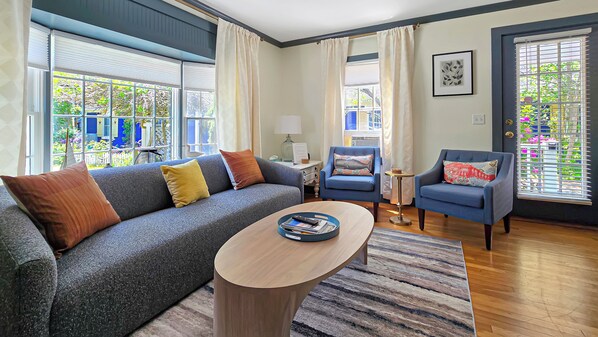 Second, the house itself is so great! The layout is perfect for a group. Large central living/dining room with a full bathroom right off of it. There were plenty of chairs in addition to the couch and armchairs, and everything is perfectly matched and cozy. The bedrooms are spacious, with large comfy beds, and the one en suite even has its own back door. Both bathrooms worked perfectly.