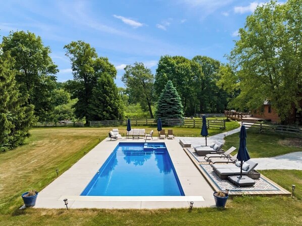 Cute & clean log cabin farm house with a great pool and jacuzzi. Huge lawn and a pond if you like fishing. The pool has comfy loungers, several umbrellas and a great automatic cover. There is a large outdoor sectional and an outdoor dining table for 8. The barn cat is adorable! When we had a few questions, the property manager was super responsive! Quiet area - secluded with lots of land and trees. Stocked with everything you need for a beautiful getaway about 1.5 hours from Chicago. Highly recommend!!