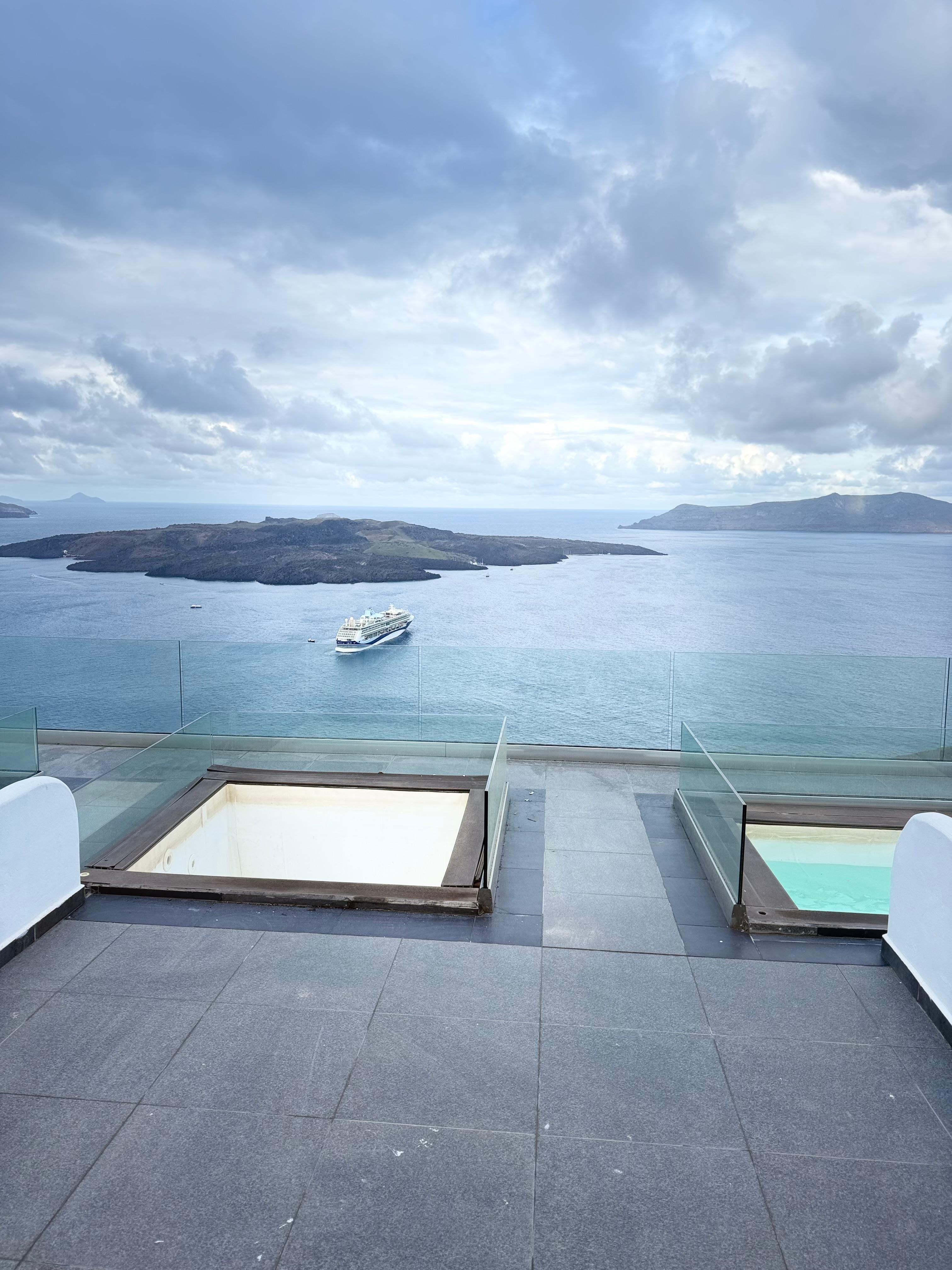 Since there was no access by vehicle we were met by Vanos? to help us with our luggage. What a great guy! I was amazed at how quickly he maneuvered through the paths of Santorini. I had a very big bag to get to the hotel and honestly would not have been able to get it there by myself. Since it was the tail end of the season, the resort was nice and quiet. I was travelling with my sister and brother-in-law and I was upgraded on my room. What a nice surprise. Rooms were very clean and attended to daily. The view from the balcony, which were very spacious was unbelievable. I always have wanted to stay on the Caldera side and this totally met my expectation! We could view the cable cars running and if the donkeys were still working, we could have seen them too. Watching all of the cruise ships coming and going was alot of fun when we were back at the hotel. The weather was a little sketchy but we were able to see a beautiful sunset that Santorini is known for while we were there. As the closure of our trip was nearing, I was getting nervous on how I was going to get my very large bag back to our pick up meeting point. My bag was now even heavier because of all my shopping! We were met with nothing less than great guest service! Vanos (?) was on it! He recruited one of his friends to help us. I was carrying 2 small bags and they blasted through the paths! I even had to take a break, which they were kind enough to make sure I was okay. Great place! Will stay again!