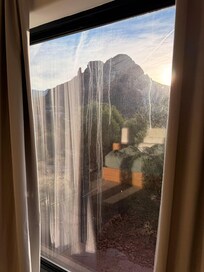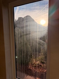 Pros: Outstanding views from the main room and the patio, good sauna, excellent hiking location, fast and prompt communication with host, most things were clean, beds were comfortable. Cons: Despite having quite a large kitchen, utensils were limited (e.g. no baking sheets, no kettle, no salad bowl) and of poor quality (dull knives, non-matching silverware) and there was no built-in ice maker (small counter top model not sufficient for a house this size).Some windows were not washed prior to our arrival and were dirty (pictures attached), which dampened the views, especially from the primary suite. All of the shower handles are installed incorrectly (hot cold and vice versa), which was puzzling and led to some cold showers before we figured it out. There are no dimmers on any of the lights in the house, which made it hard to adjust lighting to different conditions and at night the house was either very bright or very dark. WiFi was not strong enough to work in either the primary suite or the bedroom downstairs, and there are no desks in any of the bedrooms. Price to heat pool per night (100) was unreasonable given the size of the pool—when I was quoted that amount I figured the pool was sizable. It is 10 feet across. Significant discoloration of kitchen floors (picture attached) in certain places. For a different price point, these cons would be inconsequential to a star rating, but given the pricing on this house, we expected a higher quality home.