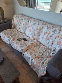 The rental unit was in poor condition. Cupboards were broken in multiple places, paneling was pealing right off. All beding was filthy and we had to wash it. Blood spots on comfortors. Sofa was greasy and stained.which caused us to put a sheet over the sofa the entire 10 days. Outdated oven was rusted. Shower curtain rings were rusted and bled on curtain and towels. Toilet stool seat was broken. Exterior balcony door had to be fixed as it wouldnt lock. Management company was very dismisive when we said ac wasnt working correctly. Temperature in unit was never comfortable the entire 10 days. Building supplies in our unit which is already very small. Beach is great. Tiki bar is great. Id rent from other company in future. This Management company doesnt get it.