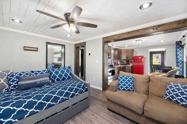 This little place is wonderful. We had a great time...We are a family of 5, and we all fit comfortably in the home. There is plenty of space for sleeping, and considering that the cottage isn't huge, the daybeds with trundles did not make it feel cluttered or tight. We loved access to the washer and dryer. The retro feel of the kitchen was a major highlight - loved the red fridge! :) Appreciated the coffee...Also liked that there were pans (baking included!) to make snacks like pizza and cookies. The home was clean, well-stocked, and we also felt it was pretty centrally located to the major highways.It was quiet, too. We had a really nice yard for walking our dog, and the yard was well-maintained, as well. The kids loved the TVs...and the home was nice and cool (it was a hot summer week!)... Most certainly better than a hotel... you won't regret staying here! :)