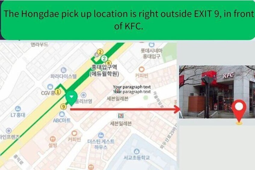 7:00 am Hongdae : Se reúne en KFC junto a la salida 9 de la estación de la Universidad Hongik (ver mapa en las fotos del recorrido).