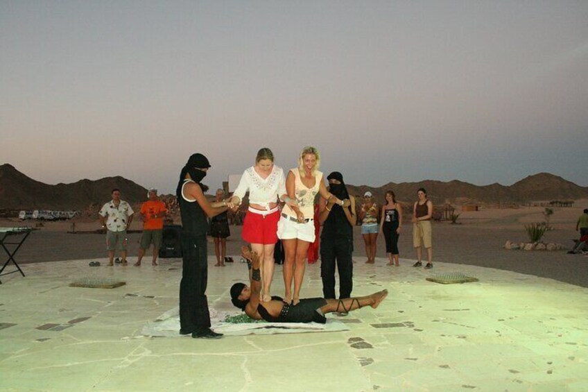 Parta en una encantadora expedición en jeep safari de día completo en Marsa Alam, que culminará con una impresionante puesta de sol, una encantadora cena y un espectáculo entretenido, con un paseo en camello. Su aventura comienza con un emocionante safari en jeep a través de los fascinantes paisajes del desierto, lo que le permite disfrutar de la belleza escarpada y las vistas tranquilas de la zona de Marsa Alam. A medida que el día se calma, presencia una espectacular puesta de sol en el desierto que llena el cielo de colores vibrantes. En un campamento tradicional beduino, saboree una deliciosa cena con sabores locales mientras disfruta de una animada actuación con música y danza tradicionales. Un relajante paseo en camello añade un toque auténtico a su experiencia en el desierto, ofreciendo una perspectiva única de la belleza natural de la noche. Esta excursión de todo el día combina a la perfección aventura, exploración cultural y paisajes impresionantes para una experiencia inolvidable.