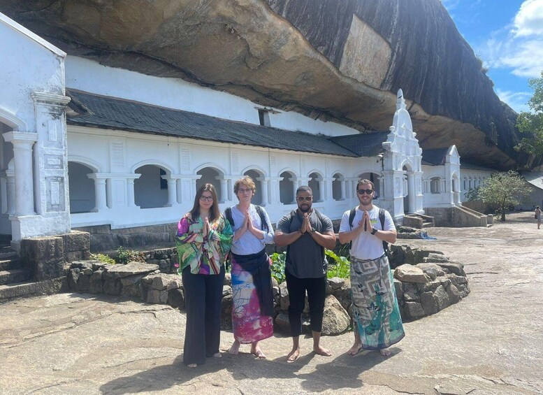 La nctualidad es clave ya que el templo de la cueva de dambulla cierra para el culto de 10:30am a 10:45 a.m. a las 10:00am, el grupo llega al sitio del patrimonio mundial de la unes. el templo es conocido por sus hermosos murales, estatuas doradas y antiguos templos excavados en la roca. una subida corta, ligeramente empinada conduce a las cuevas, con increíbles vistas desde la parte superior. Llegar antes del cierre significa que puede disfrutar de la visita sin prisas y empaparse de la historia y el ambiente.