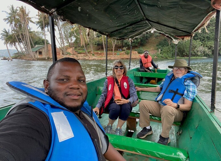 A continuación, dé un paseo en barco por el río y hacia el lago Victoria. Ve monos, monitorea lagartos, pitones y quizás incluso un auténtico brujo africano. Admire un entorno natural verdaderamente espectacular que es ideal para la observación de aves y permite pasear por la naturaleza.