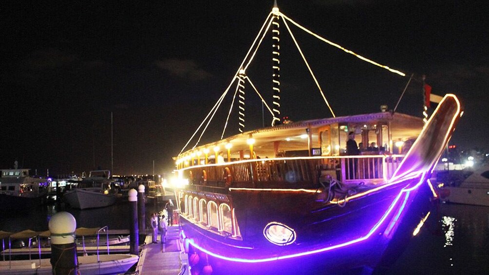 ¡El crucero Dubai Marina Dhow ofrece a los turistas un placer diferente! Si alguien quiere vivir un evento memorable desde hace mucho tiempo, debe probar este crucero. Una ciudad con canales según la tradición veneciana, donde disfrutará de los lugares y monumentos más inspiradores de Dubái y tendrá una hermosa vista de la ciudad bajo una nueva luz. Dubái es la octava maravilla del mundo. En el crucero Dubai Marina Dhow Cruise recorrerá dos millas de la costa del Golfo Pérsico y observará los lugares emblemáticos de Dubái.