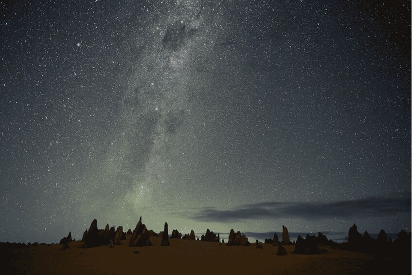 Cuando anochezca, se dirigirá al pueblo pesquero de Cervantes para disfrutar de la cena incluida en una taberna tradicional de Australia Occidental para disfrutar de un verdadero ambiente australiano. Después de la cena, regresará a la noche y regresará al Desierto Pináculo para experimentar el cielo nocturno lleno de estrellas sin contaminación lumínica, en el entorno tranquilo del parque nacional.