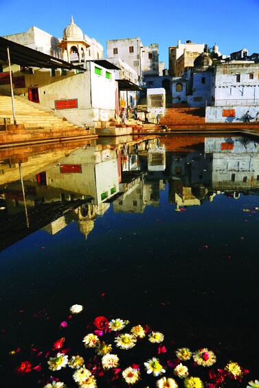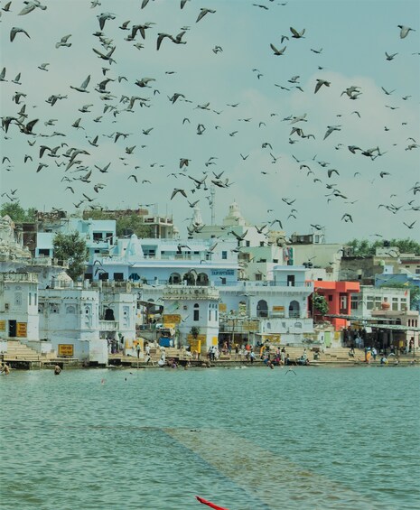 Pushkar, una pequeña ciudad sagrada para los hindúes y ahora una atracción turística por su feria anual de camellos, la más grande del mundo. Es un lugar de peregrinación para hindúes y sijs. Pushkar tiene muchos templos. Han crecido muchas leyendas sobre el origen de Pushkar. Según uno de ellos, un loto se escapó de las manos del Señor Brahma y cayó sobre la tierra. El agua brotó del lugar donde cayó. Así se creó el lago de Pushkar en el desierto de Thar. Pushkar es uno de los lugares de peregrinación tradicionales «únicos en la vida». Pushkar se encuentra a orillas del lago Pushkar, que tiene muchos ghats donde se bañan los peregrinos. A lo largo de los siglos, se convirtió en una ciudad de templos y hoy en día hay hasta 400 templos en Pushkar. La ciudad actual fue renovada en el siglo IX por un rey parihar de Mandor, cuando se curó de una enfermedad de la piel tras un chapuzón en el lago Pushkar. Pushkar es un laberinto de templos, ashrams (ermitas) y dharamshalas (casas de descanso) y uno nunca está lejos del sonido de la adoración y los devotos. El lago Pushkar está delimitado por 52 ghats construidos a lo largo de los siglos por reyes y nobles (está prohibido fotografiar en los ghats). También es importante por sus gurdwaras para Guru Nanak y Guru Gobind Singh. Uno de los ghats de baño se llama Gobind Ghat, construido por los marathas en memoria de Guru Gobind Singh. Para limpiar completamente los pecados, hay que pasar tres crepúsculos en Pushkar y bañarse en los tres ghats importantes y venerados: Varah, Brahma y Gau Ghats.