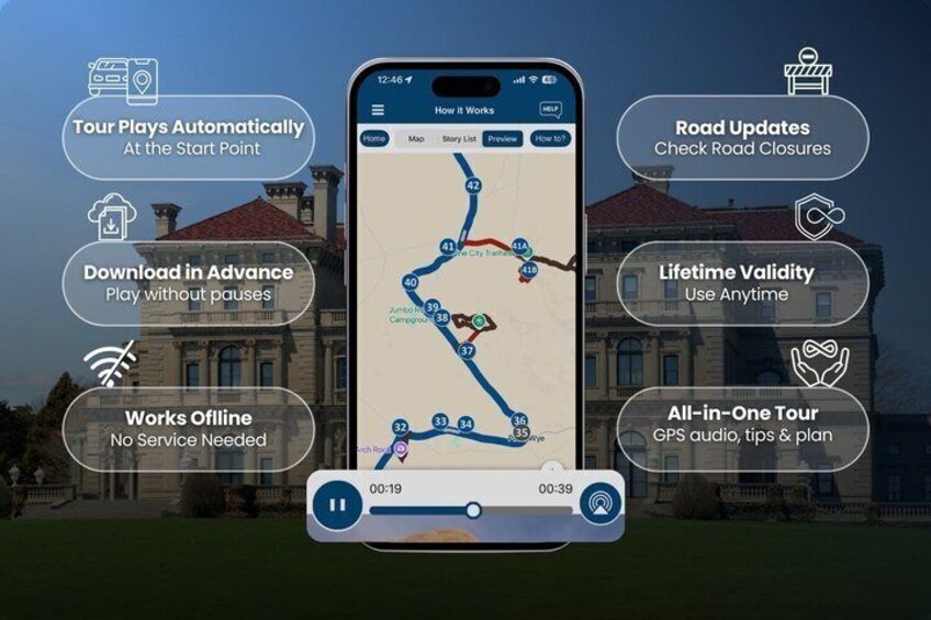 - Viajar sin preocupaciones: Utilice la aplicación de tour en cualquier momento, en cualquier día y durante varios días. Comience y detenga el recorrido cuando desee, tomando descansos y explorando excursiones secundarias a su propio ritmo. Salta cualquier cosa que no te importe o explora contenido extra para todo lo que te interese