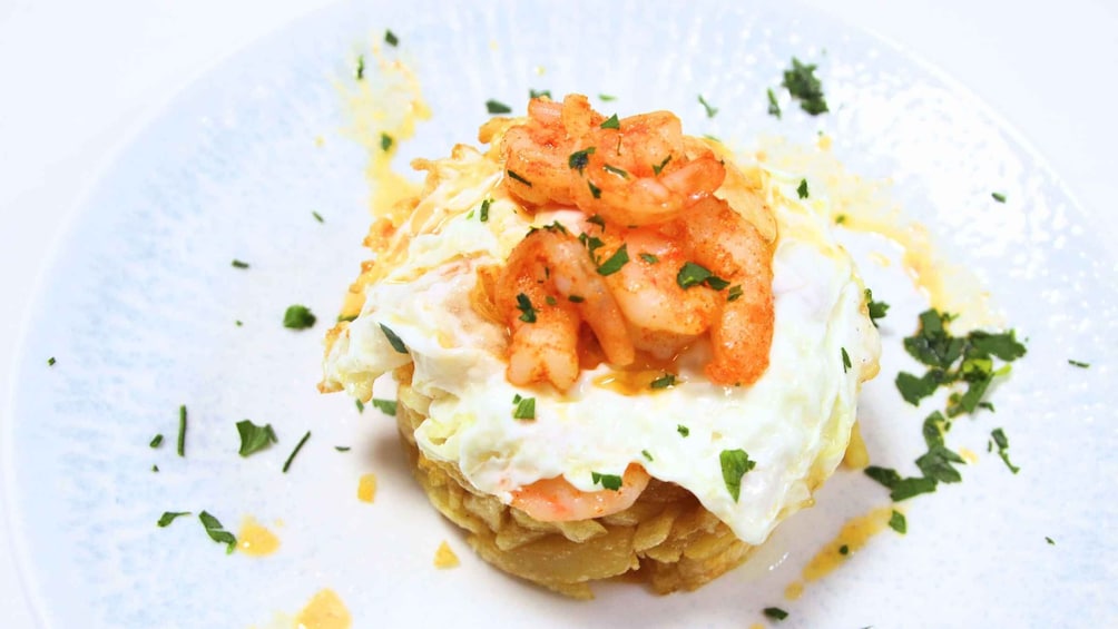Elige la opción de menú sugerida por el chef para compartir entre dos una bandeja de queso, jamón ibérico y encurtidos. Saborea una ensalada de pulpo con un peine, calamares pequeños fritos con huevos fritos y rodajas de pimiento, y un plato principal de risotto ibérico de mejilla o salmón al horno con salsa “La Cantaora” con papas picantes.